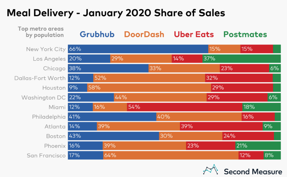 There are companies such as Door Dash, Uber Eats and Grub Hub that are likely operating in your community already. The chart below gives you an idea of who might have a stronger market share in your area. Partnering with one of these companies requires that you spend some time and few dollars to sign up.